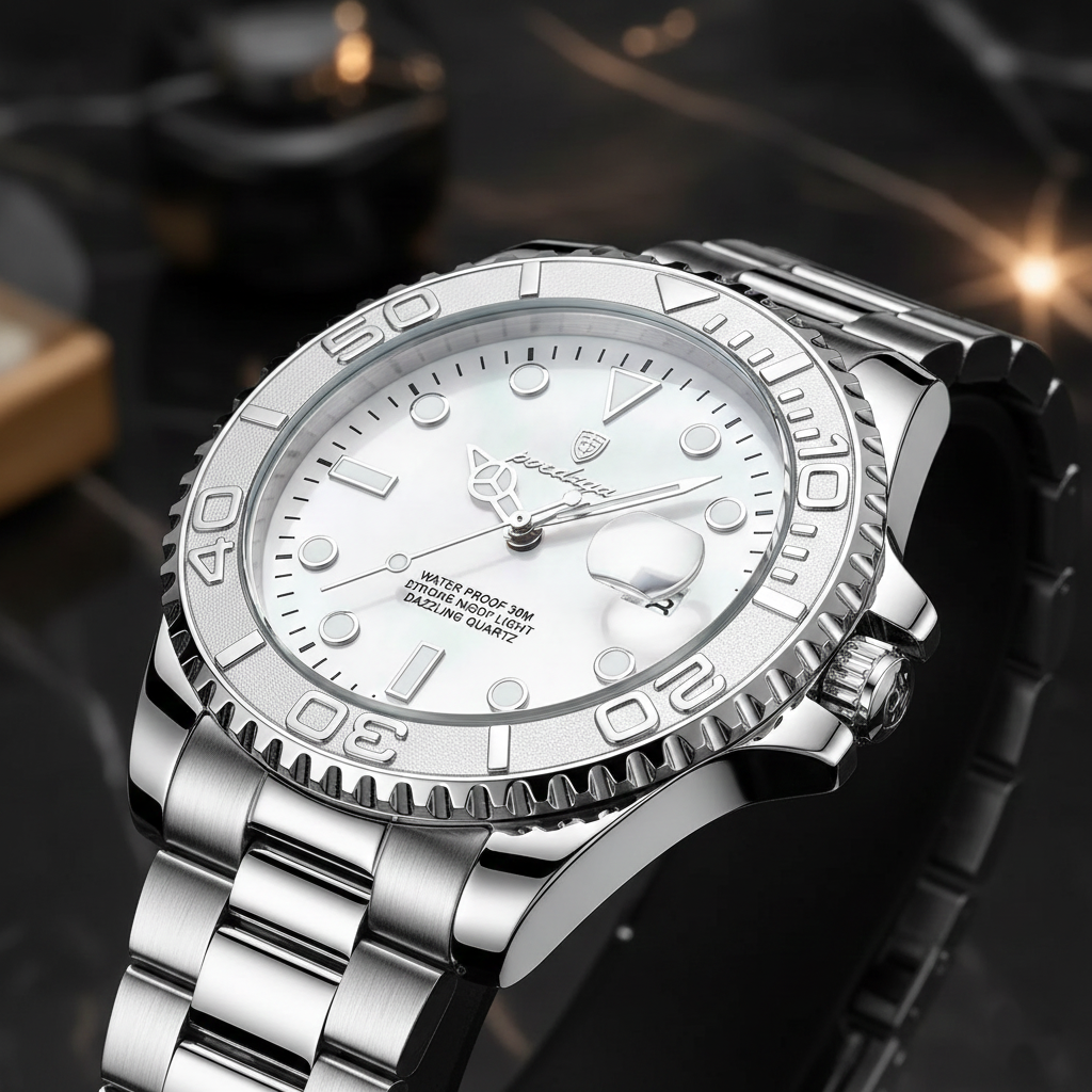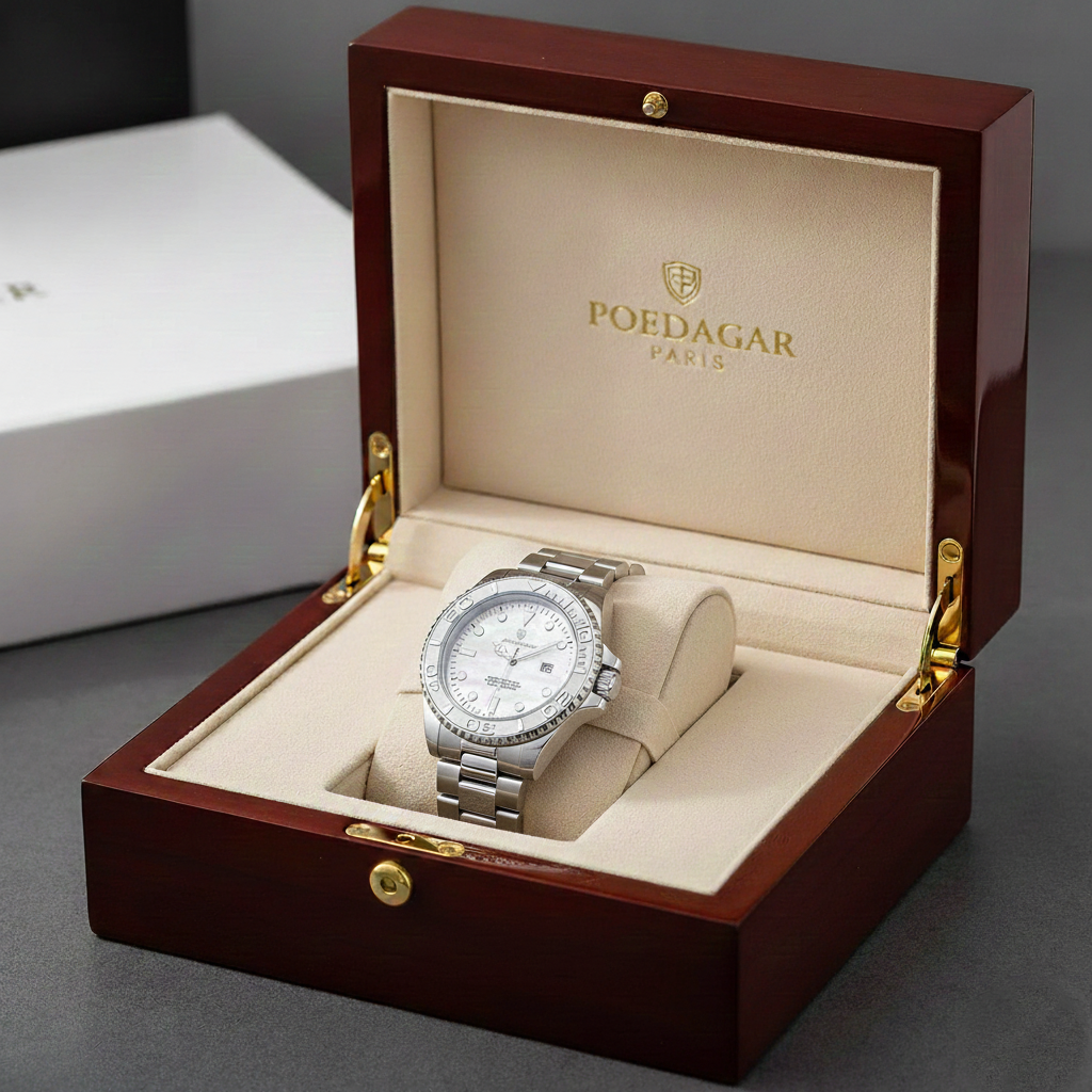 Épurée, brillante et résolument moderne, la Poedagar Master Silver Yacht impose son style avec un design entièrement en acier inoxydable. Son cadran blanc nacré, associé à une lunette gravée, offre un rendu lumineux qui accroche l’œil instantanément.